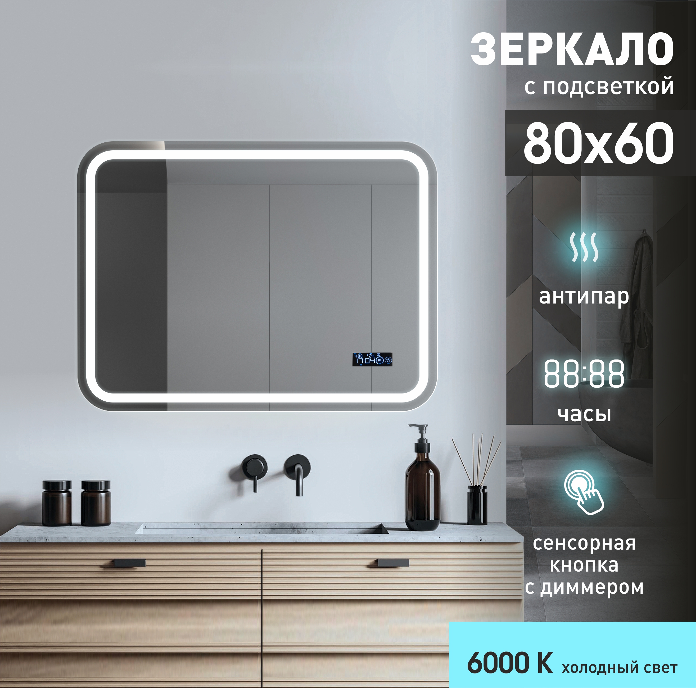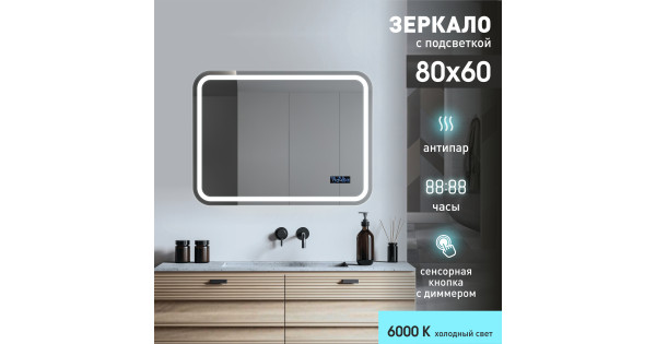 Зеркало с фронтальной подсветкой, с сенсорной кнопкой, часами, датой, подогревом, датчиком температуры Lima 8060mh-6 (80*60 см) в светонепропускающем коробе/холодный светколлекция "Travel"Уникальное led-зеркало с фоновой подсветкой «Lima» станет на..