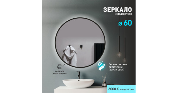 Зеркало с фоновой подсветкой, торцевым датчиком движения и чёрной УФ-окантовкой Tokyo black 60d2-6 (d 60 см)-холодный светколлекция "Travel"Led-зеркало "Tokyo" с торцевым датчиком движения (бесконтактное включение) и чёрной окантовкой - выполнена м..