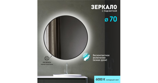 Зеркало с фоновой подсветкой, торцевым датчиком включения и чёрной УФ-окантовкой Tokyo black 70d2-6 (D 70 см)-холодный светсерия "Travel"Led-зеркало "Tokyo" с торцевым датчиком движения (бесконтактное включение) и чёрной окантовкой - выполнена мето..