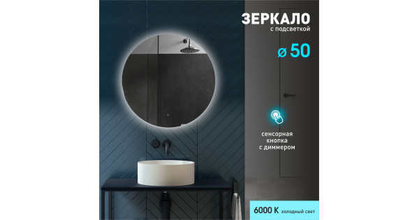 Зеркало с фоново-фронтальной подсветкой и сенсорной кнопкой Oslo 50s-6 (D 50 см) - холодный светколлекция «Travel»Led-зеркало с сенсорной кнопкой с диммером (регулировкой яркости света). Для включения зеркала достаточно дотронуться до с..