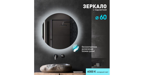 Зеркало с фоновой подсветкой и торцевым датчиком включения Tokyo 60d2-6 (D 60 см) - холодный светколлекция «Travel»Led-зеркало с торцевым датчиком движения (бесконтактное включение). Для включения зеркала достаточно сделать взмах рукой со сто..