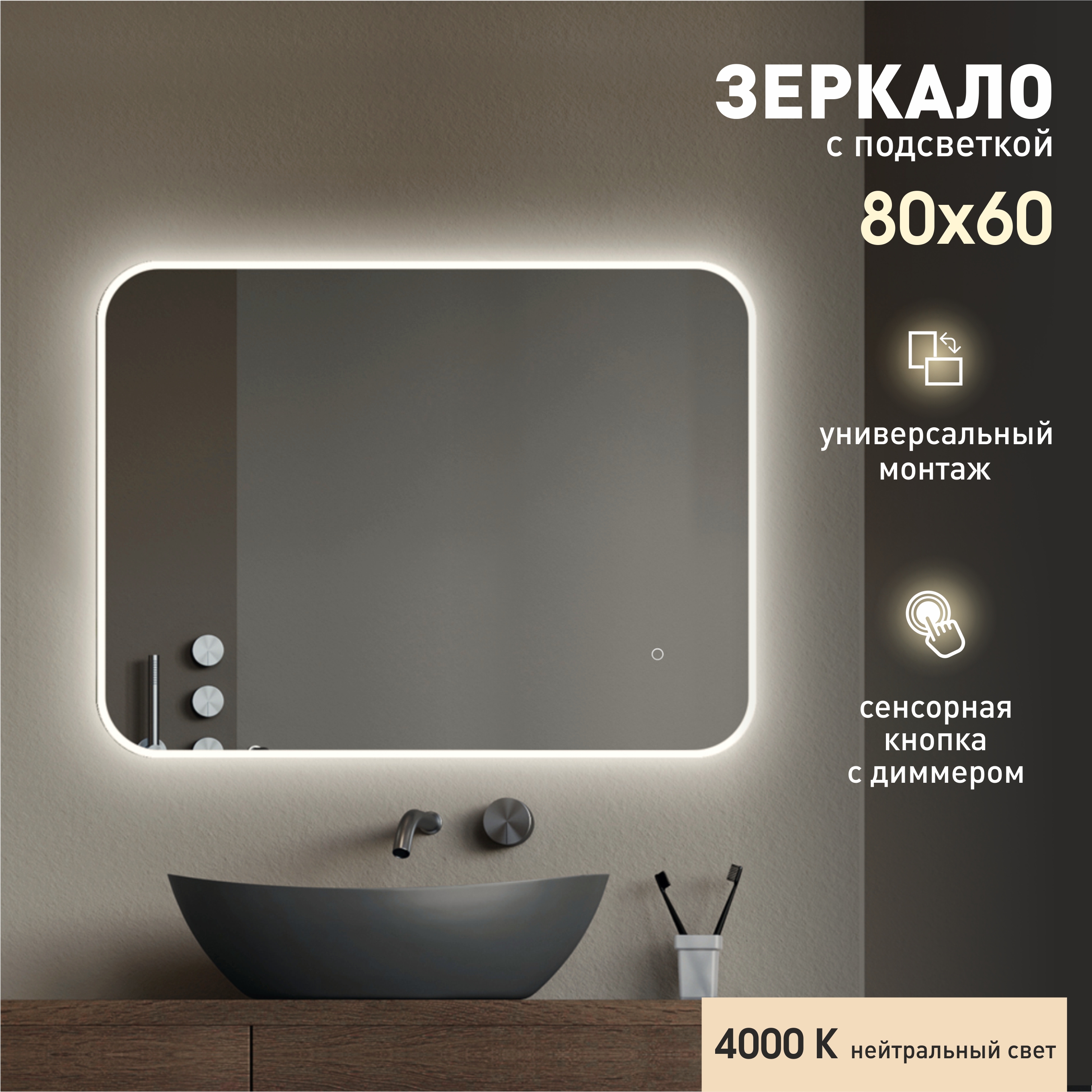 Зеркало с фоново-фронтальной подсветкой и сенсорной кнопкой Milan 8060s-4 (60x80 см) - нейтральный светколлекция «Travel»Led-зеркало с сенсорной кнопкой с диммером (регулировкой яркости света). Для включения зеркала достаточно дотронуть..