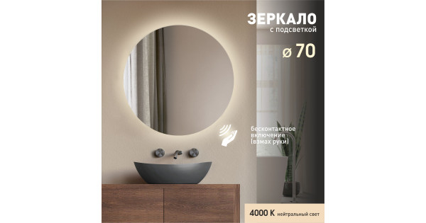 Зеркало с фоновой подсветкой Tokyo 70-4 (D 70 см) - нейтральный свет коллекция «Travel»Зеркало без сенсорной кнопки – отличный вариант для тех, кому не нравится светящийся кружок на зеркале. Разработано специально для выведения к электро..