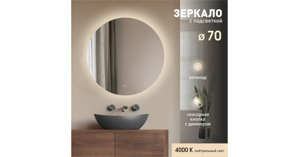 Зеркало с фоновой подсветкой и сенсорной кнопкой Tokyo 70s-4 (D 70 см) - нейтральный светколлекция «Travel»Led-зеркало с сенсорной кнопкой с диммером (регулировкой яркости света). Для включения зеркала достаточно дотронуться до сенсора...