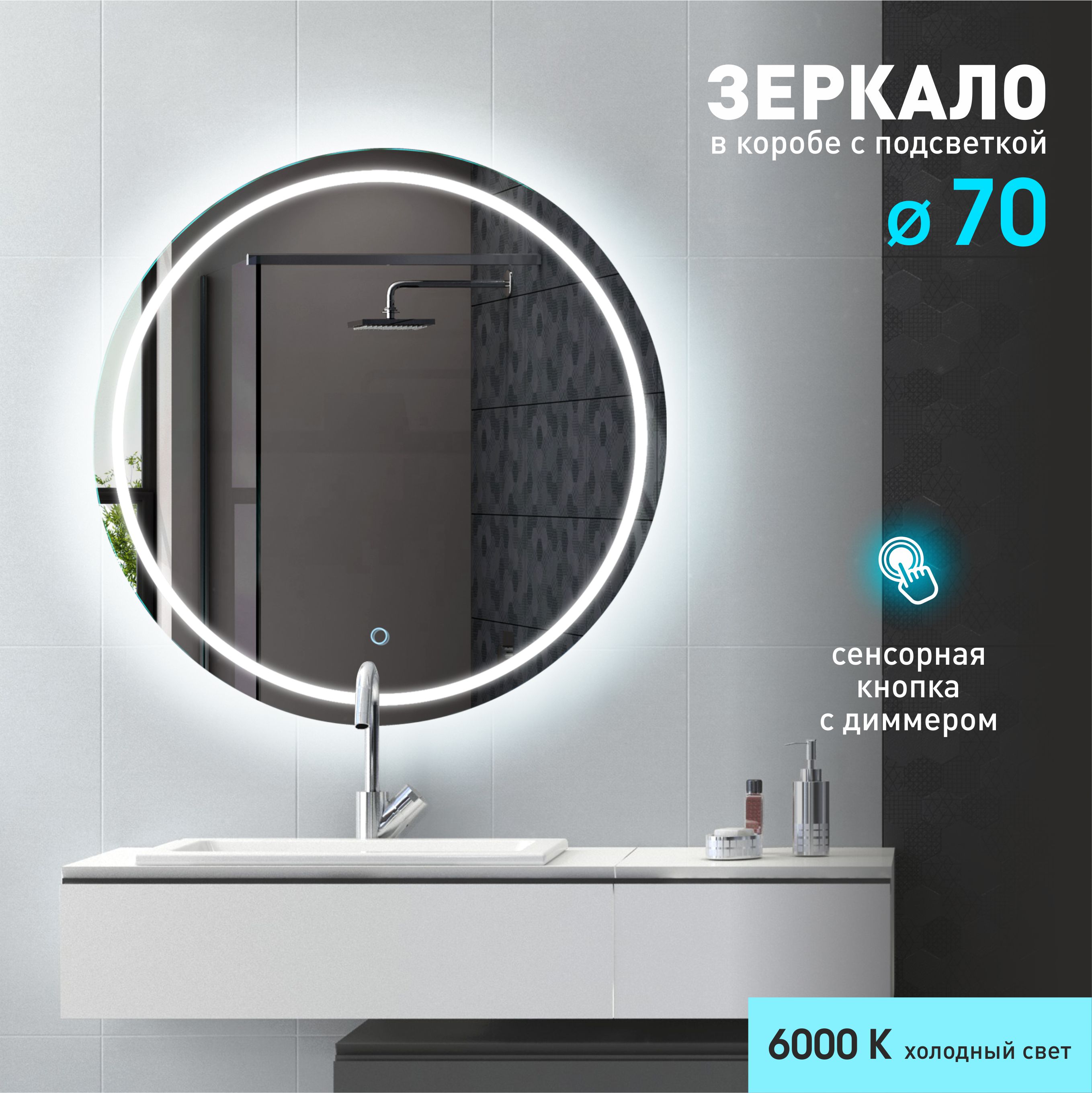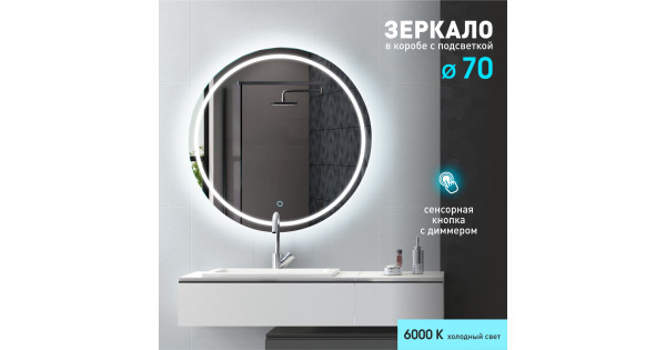 Зеркало с фронтально-фоновой подсветкой, c сенсорной кнопкой Cairo 70s-6 (D 70 см)в прозрачном коробе/холодный светколлекция "Travel"Led-зеркало "Cairo" с сенсорной кнопкой с диммером (регулировкой яркости света). Для включения зеркала достаточно д..