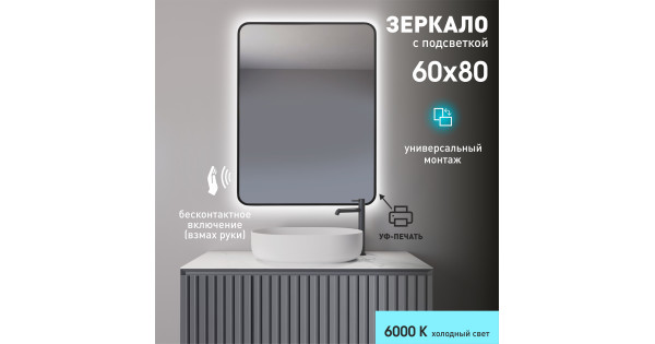 Зеркало с фоновой подсветкой, с торцевым датчиком движения и чёрной УФ-окантовкой Hanoi black 8060d2-6 (80х60 см) – холодный светколлекция «Travel»Данная модель led-зеркала с чёрной окантовкой. Окантовка выполнена методом УФ-печати, шир..