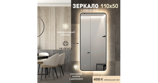 Зеркало с фоновой подсветкой, с сенсорной кнопкой и чёрной УФ-окантовкой Hanoi black 11050s-4 (110x50 см) – нейтральный светколлекция «Travel»Зеркало с эффектом парения, за счет того, что в качестве подсветки используется светодиодная л..