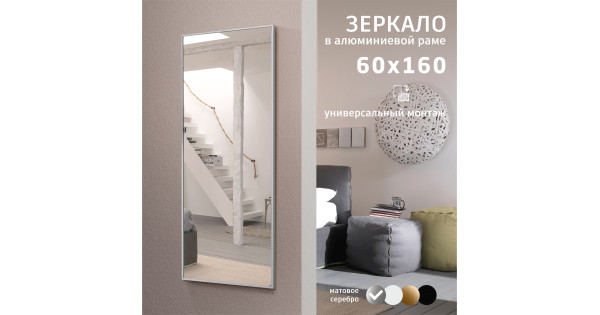 Зеркало Ма1nu-16060silver (160х60 см) в алюминиевой раме/сереброМинималистичный дизайн зеркала впишется в любой интерьер. Благодаря особому виду креплений, зеркало может быть установлено напольно, либо выполнять роль настенного. Рамы для зеркал изг..
