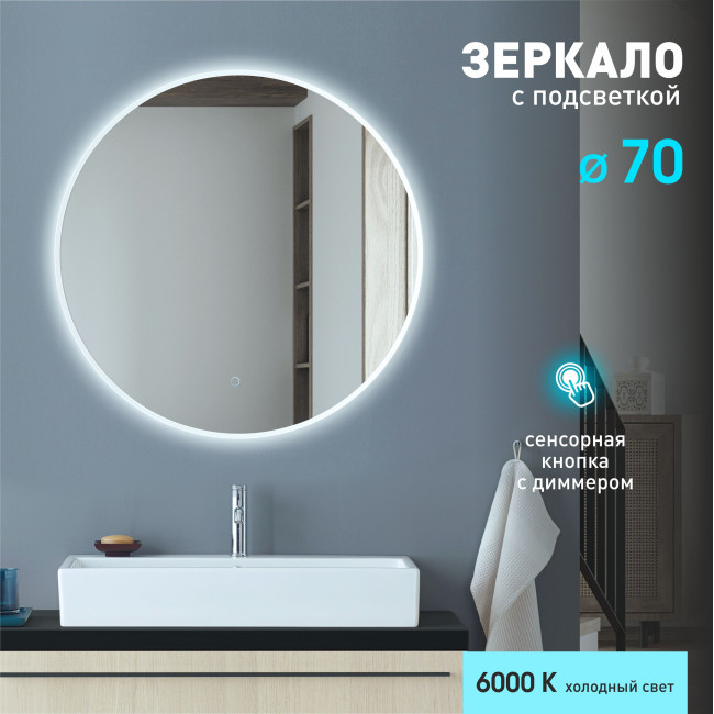 Описание Зеркало с фоново-фронтальной подсветкой и сенсорной кнопкой Oslo 70s-6 (D 70 см) - холодный свет