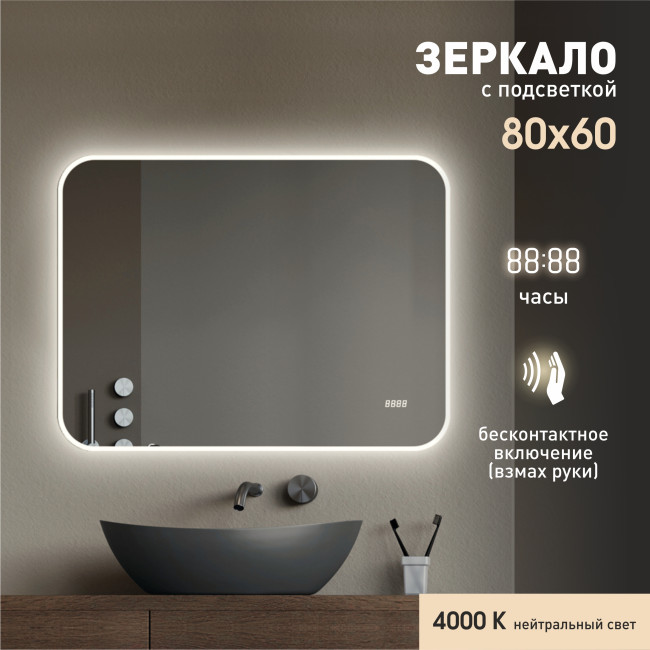 Описание Зеркало с фоново-фронтальной подсветкой, с датчиком движения и часами Milan 8060d2c-4 (60x80 см) - нейтральный свет