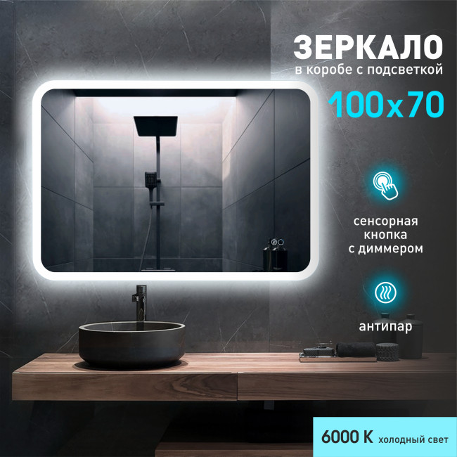 Описание Зеркало с фоново-фронтальной подсветкой, с сенсорной кнопкой и подогревом Palmer 10070sh2-6 ( 100х70 см) в светопропускающем коробе- холодный свет