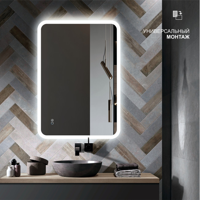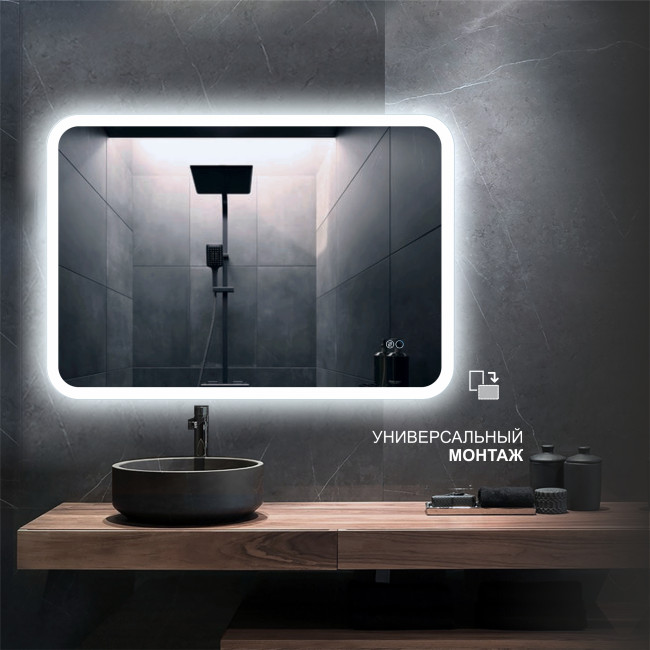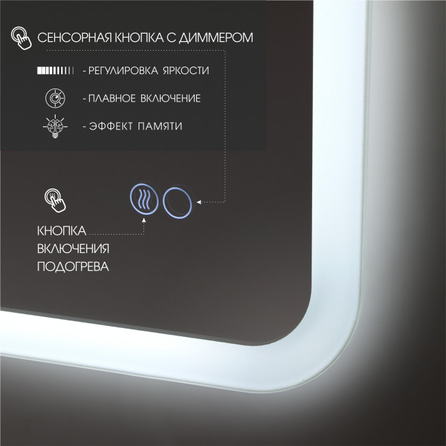 Данная модель led-зеркала с двойной сенсорной кнопкой. Первая включает подсветку, вторая активирует функцию подогроева, которая помогает предотвратить запотевание зеркала. Это особенно полезно в ванных комнатах, где высокая влажность может затруднить обзор. «Антипар» работает благодаря двойному мату подогрева размером 570х450 мм, смонтированному по центру с обратной стороны зеркала. Для изменения яркости света подержите палец на сенсоре, благодаря диммеру (регулировка яркости свечения) - плавное включение света всегда будет радовать Ваши глаза. Также кнопка имеет память и все последующие включения будут на последнем уровне яркости.