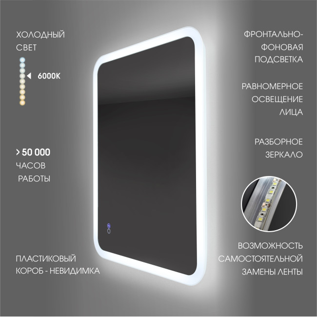 Светодиодная лента прикреплена к алюминиевому профилю, что уменьшает нагревание диодов и увеличивает их срок эксплуатации в 2 раза. Зеркало изготовлено из зеркального влагостойкого полотна 4мм от ведущего европейского производителя зеркал AGC. Цвет света холодный (6000К).
