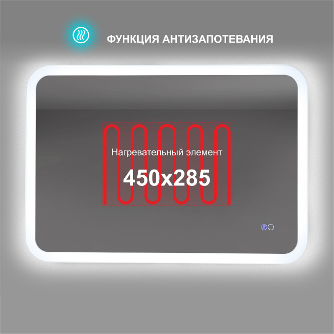 Данная модель led-зеркала с двойной сенсорной кнопкой. Первая включает подсветку, вторая активирует функцию подогроева, которая помогает предотвратить запотевание зеркала. Это особенно полезно в ванных комнатах, где высокая влажность может затруднить обзор. «Антипар» работает благодаря двойному мату подогрева размером 450х225 мм, смонтированному по центру с обратной стороны зеркала. Для изменения яркости света подержите палец на сенсоре, благодаря диммеру (регулировка яркости свечения) - плавное включение света всегда будет радовать Ваши глаза. Также кнопка имеет память и все последующие включения будут на последнем уровне яркости.