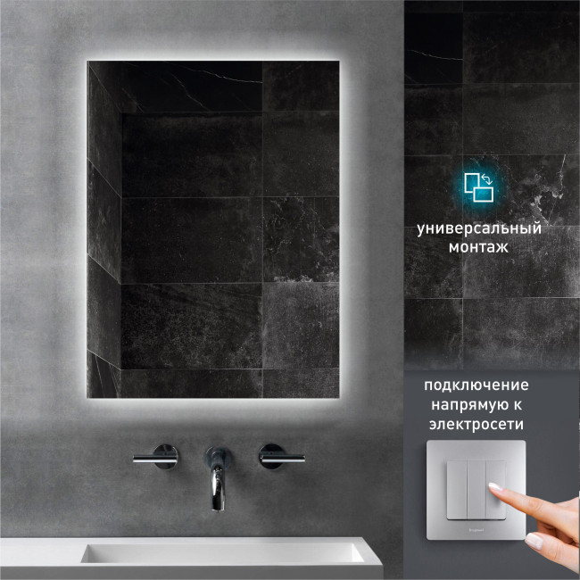 Зеркало без сенсорной кнопки – отличный вариант для тех, кому не нравится светящийся кружок на зеркале. Разработано специально для выведения к электросети под клавишу вкл/выкл света. Подсветка будет включаться непосредственно при включении света.
