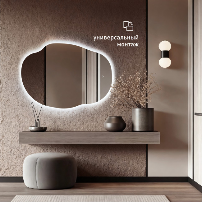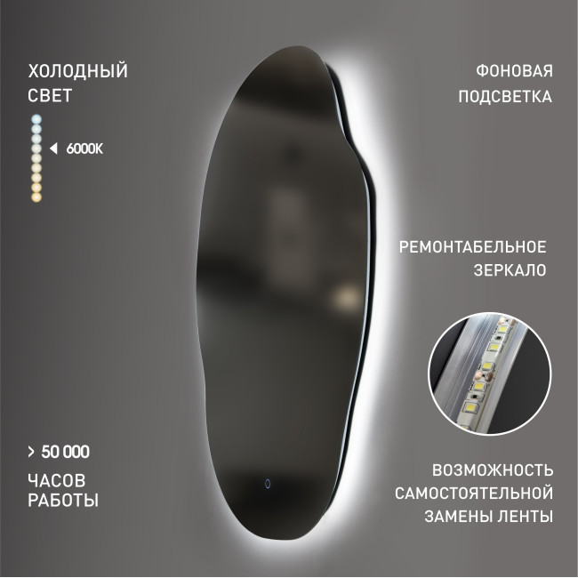 Необычная форма зеркала «Fiji» привлекает внимание и делает его превосходным декоративным элементом. Открытая фоновая подсветка гармонично подчёркивает контуры изделия, добавляя ему уникальности и изысканности. Изготовлено из зеркального полотна толщиной 4мм, уровень пылевлагозащиты IP-20. Зеркало предназначено для использования в помещениях в низкой влажностью: спальни, гостиные, коридоры и других сухих зонах. Цвет света холодный (6000K).
