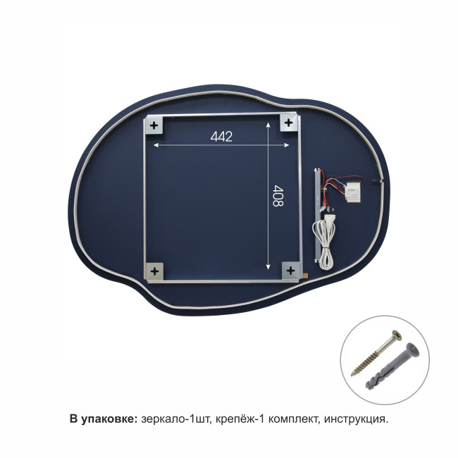 Комплектация: дюбель-крючки 2шт., шнур с вилкой (для проверки корректной работы зеркала), руководство по эксплуатации.