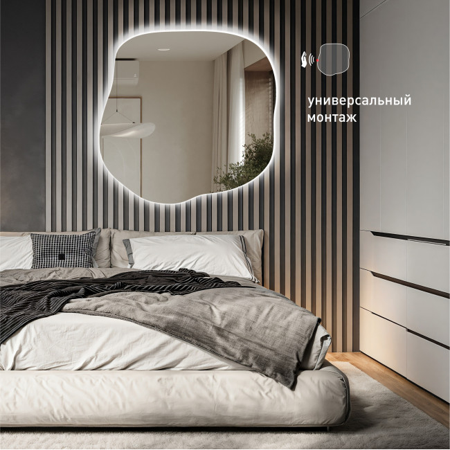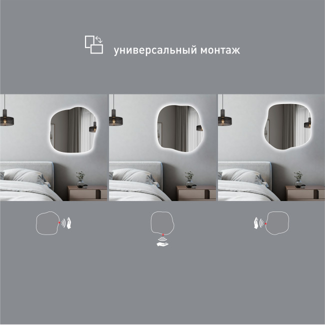 Зеркало с торцевым датчиком движения (бесконтактное включение). Для включения зеркала достаточно сделать взмах рукой со стороны датчика на расстоянии 4-7 см. Датчик оснащен диммером - для регулировки яркости подсветки подержите руку в зоне действия датчика. Благодаря функции памяти, все последующие включения будут на последнем уровне яркости. Датчик смонтирован на обратной стороне зеркала (за зеркальным полотном) и незаметен для глаз. Бесконтактное включение позволяет избежать отпечатков пальцев и легко поддерживать зеркало в чистоте.