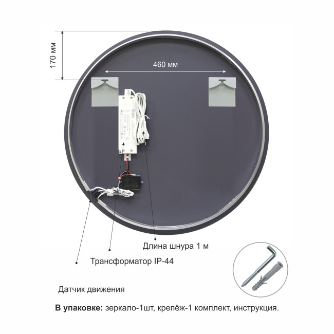 Зеркало с торцевым датчиком движения (бесконтактное включение). Для включения зеркала достаточно сделать взмах рукой со стороны датчика на расстоянии 4-7 см. Датчик оснащен диммером, для регулировки яркости подсветки подержите руку в зоне действия датчика. Датчик имеет память (все последующие включения будут на последнем уровне яркости) и приятное для глаз плавное включение света. Датчик смонтирован на обратной стороне зеркала за зеркальным полотном и незаметен для глаз. Бесконтактное включение позволяет избежать отпечатков пальцев и легко поддерживать зеркало в чистоте.