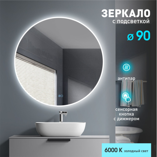Зеркало с фронтально-фоновой подсветкой, сенсорной кнопкой и подогревом Oslo 90sh-6 (D 90 см) - холодный свет.