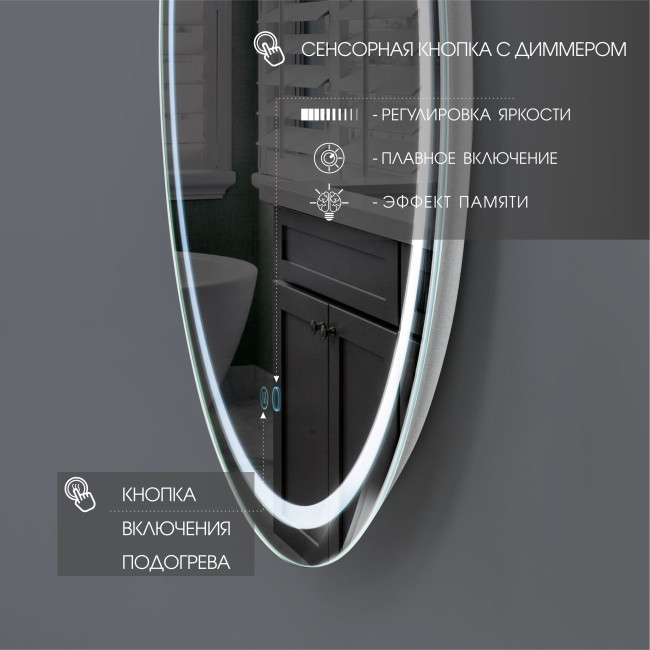 Led-зеркало "Boston" с двойной сенсорной кнопкой. Одна кнопка с диммером (регулировкой яркости света) для включения подсветки, вторая кнопка активирует подогрев. Для включения зеркала достаточно дотронуться до сенсора. Для изменения яркости света подержите палец на сенсорной кнопке. Благодаря эффекту памяти, все последующие включения будут на последнем уровне яркости. Функция подогрева (антизапотевание) работает благодаря мату подогрева размером 285х225мм, смонтированному по центру с обратной стороны зеркала.