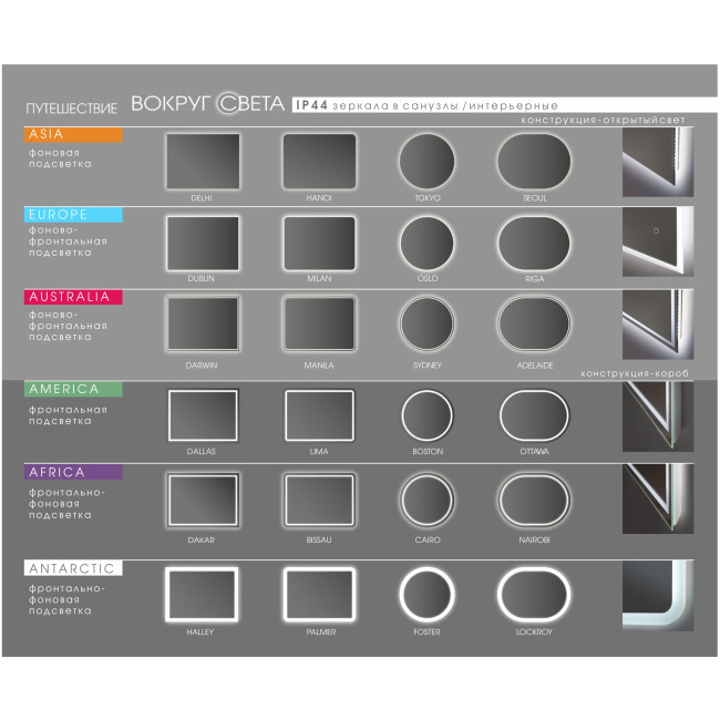 Зеркало с фронтальной подсветкой «Lima» изготовлено из зеркального влагостойкого полотна толщиной 4мм от ведущего европейского производителя зеркал AGC. Цвет света холодный (6000К). Светодиодная лента прикреплена к алюминиевому профилю, что уменьшает нагревание диодов и увеличивает их срок эксплуатации в 2 раза. Диоды, защищенные специальным силиконом, и трансформатор с высоким классом защиты обеспечивают пыле- и влагозащиту на уровне IP67, что позволяет использовать данное зеркало в помещениях с повышенной влажностью, например, туалеты и ванные комнаты. Пластиковый короб закрывает светодиодную ленту, при этом конструкция короба имеет скошенный край и утоплена под зеркальное полотно, что делает его максимально незаметным.