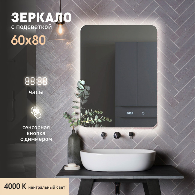 Зеркало с подсветкой, с сенсорной кнопкой и часами Hanoi 6080sс-4 (80x60 см) - нейтральный свет