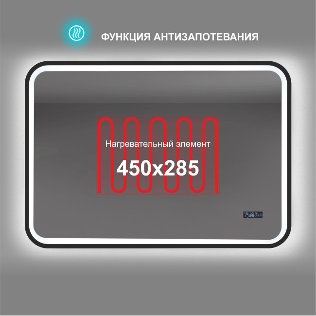 Подогрев осуществляет функцию антизапотевания, что очень удобно при принятии водных горячих процедур. «Антипар» работает благодаря двойному мату подогрева размером 450х225 мм, смонтированному по центру с обратной стороны зеркала.