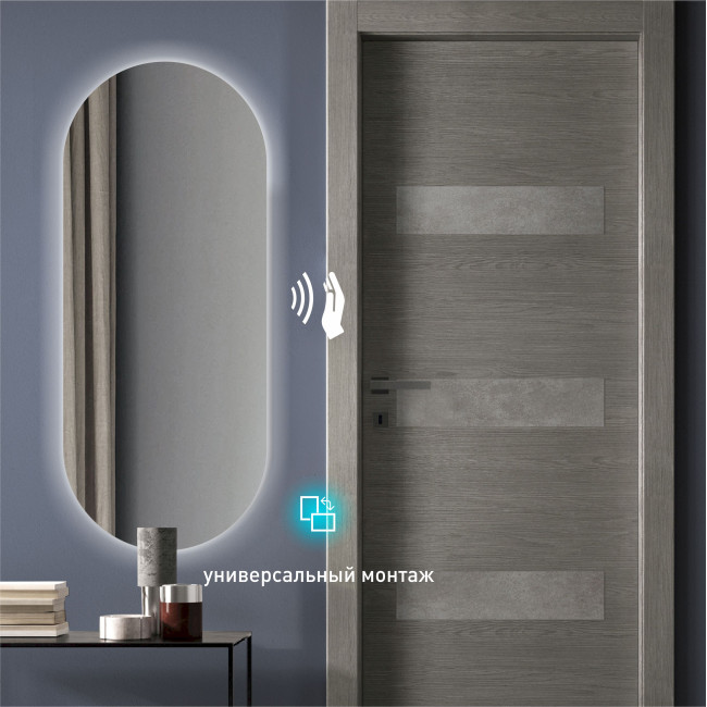 Led-зеркало с торцевым датчиком движения (бесконтактное включение). Для включения зеркала достаточно сделать взмах рукой со стороны датчика на расстоянии 4-7 см. Датчик оснащен диммером, для регулировки яркости подсветки - подержите руку в зоне его действия. Благодаря тому, что датчик имеет память, все последующие включения будут на последнем уровне яркости света. Бесконтактное включение позволяет избежать отпечатков пальцев и легко поддерживать зеркало в чистоте. Датчик смонтирован на обратной стороне зеркала за зеркальным полотном и незаметен для глаз.