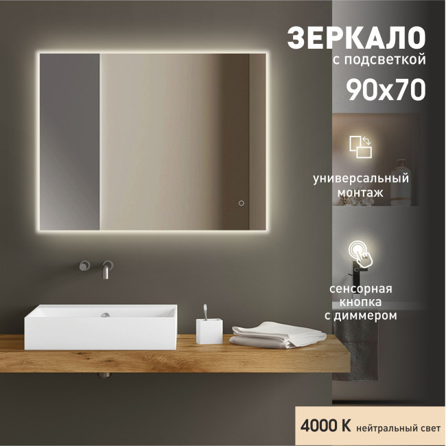 Зеркало с подсветкой, сенсорной кнопкой Delhi 9070s-4 (70x90 см)- нейтральный свет, 1 шт